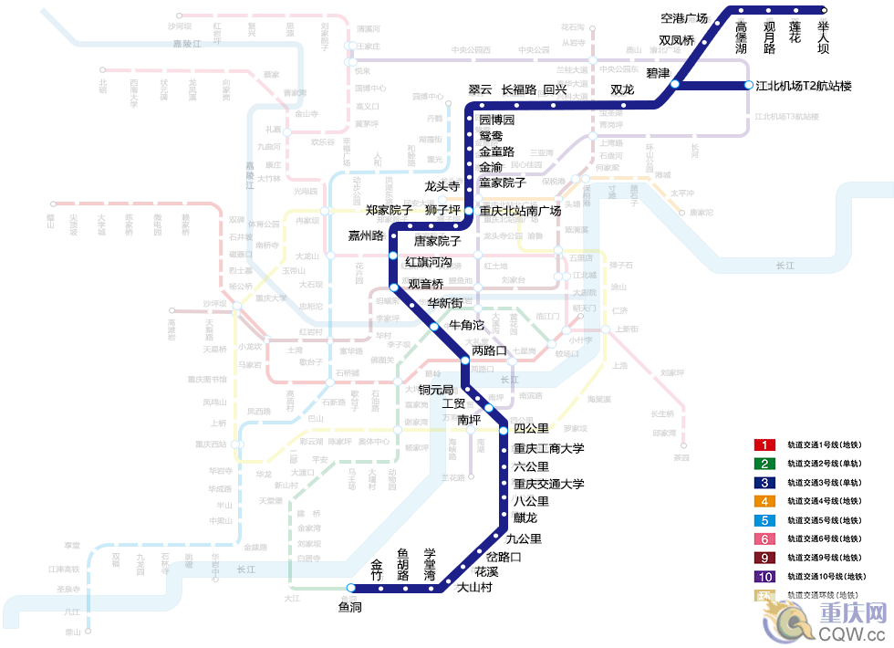 重慶軌道交通3號(hào)線南起魚(yú)洞,北至江北機(jī)場(chǎng),采用跨座式單軌交通制式,是南北方向的軌道交通骨干線,線路連接2個(gè)火車站(菜園壩和重慶北站)、4個(gè)長(zhǎng)途汽車站(四公里、菜園壩、紅旗河溝和龍頭寺)、2個(gè)城市商業(yè)副中心(南坪商業(yè)副中心、觀音橋商業(yè)副中心),是緩解重慶主城交通壓力的重要軌道交通干線。