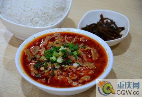 推薦理由:開(kāi)了幾年的小館子,典型重慶本土美食,上桌的標(biāo)配是一碗白飯,一碗肥腸,一盤(pán)泡菜,一碗米湯。肥腸入味不算很辣,除了肥腸飯還提供排骨和牛肉。