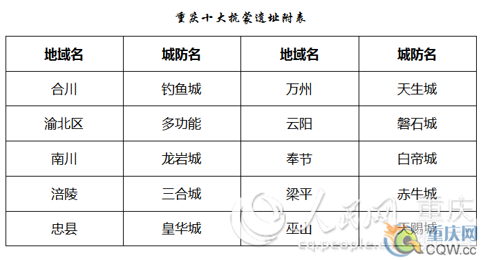 南宋末年,巴渝安危緊聯(lián)南宋政權(quán)安危。在宋末彭大雅筑城固守基礎(chǔ)上,余玠正式將四川首府從成都遷至重慶,設(shè)帥府,根據(jù)川東山川形勢和流域特征,以合川釣魚城為核心修筑山城防衛(wèi)體系20余座,拱衛(wèi)全川,以重慶城為中心的南宋抗蒙山城防御體系,是繼我國春秋戰(zhàn)國時期的城池筑城和秦漢時期的長城筑城體系之后的一種全新形式,城塞的構(gòu)筑規(guī)模大,軍事功能強(qiáng),突出特點(diǎn)是:以險筑城,城塞一體,防御陣地堅固,有田池林木可供長期駐守,以城塞為點(diǎn),江河為線,形成了點(diǎn)線結(jié)合、網(wǎng)狀分布的防御格局,以重慶為大本營,釣魚城為屏障支柱,既有梯次配備、重點(diǎn)部署、又有戰(zhàn)略縱深。各城相互聲援,構(gòu)成有效防御體系,成功抗擊蒙軍四十年,重慶十大抗蒙城堡群落遺址,不僅延緩了南宋政權(quán)幾十年,同時,改變了歐洲歷史,世界格局,更是重慶眾多古城池遺址的最重要代表。