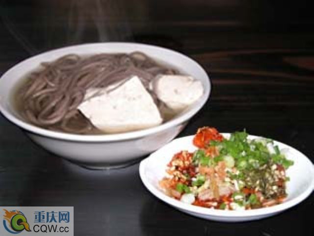 4、食用時將煮熟的豆花盛裝在一碗內(nèi),蓋上煮熟的蕎面。用一小碟拌勻的佐料。用筷子將蕎面和豆花挑進(jìn)小碟內(nèi),邊蘸佐料邊吃