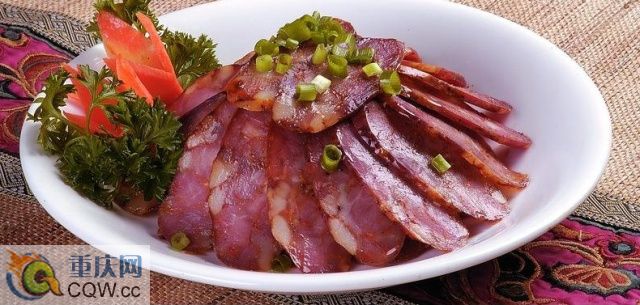大足縣生產(chǎn)。精選豬肉,配以輔料注入腸衣定型后,經(jīng)無煙烘烤制成。本品色澤油潤,紅白分明,腸身干爽有彈性,味道鮮美。分廣味、川味兩種。