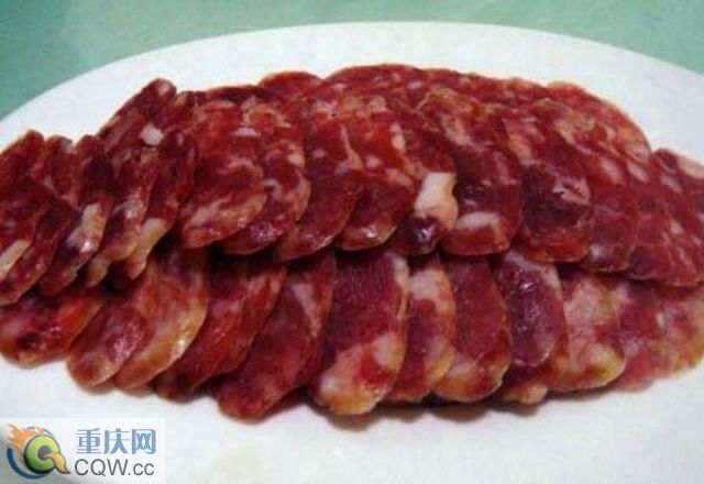 鮮豬肉用溫水洗凈,瘦肉切成胡豆粒大小的肉丁,肥肉粒約為瘦粒的一半大,然后加料拌腌。在肉料中加入食鹽、白酒、花椒粉、姜粉及其它香料,拌勻。即可灌入選好、洗凈的豬腸衣內(nèi)。灌餡時要用針刺腸衣,以排出空氣,每12至15厘米扎1個節(jié)。灌好的香腸,用溫水洗凈,掛在竹桿上,上火炕烘烤兩天。烘烤時,要適時翻動,炕溫保持在600C左右,防止跑油。加工好的香腸,應(yīng)為腸身干爽,結(jié)實有彈性,瘦肉色澤鮮紅或暗紅色,肥肉色澤乳白而呈透明狀。成品紅白分明,鮮美爽口,佐餐下酒皆宜。