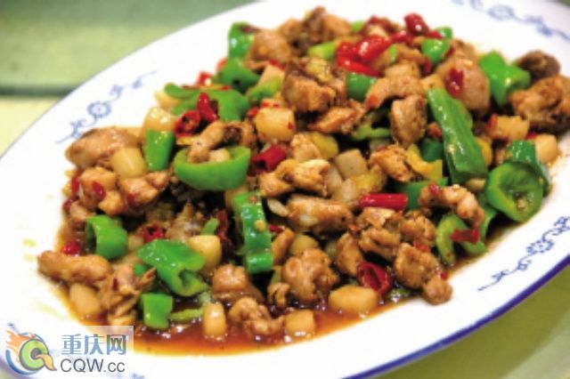 小煎雞的原料是農(nóng)戶散養(yǎng)且未開叫的仔公雞和本地辣椒。連肉帶骨的雞肉爆干水分后,適量綠尖椒、花椒、姜、蒜等一同下鍋煎炒,炒到有香辣味時把剛剛爆好的雞肉倒下鍋一起翻炒,直到滿屋香氣,再加少量老抽醬油、白糖,翻勻以后起鍋裝盤,最后在裝好盤的雞肉上灑點白芝麻,一盤地道的小煎雞就做好了。辣中帶香,香中帶辣,看了讓人不停的吞口水。