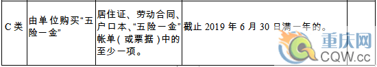 C類:務(wù)工人員(有合法的工作證明、勞務(wù)合同且由單位繳納“五險(xiǎn)一金”之一,2019年6月30日滿一年)。