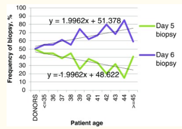 - 在一組≥45歲的女性中,85.1%的胚胎活檢延遲到了第6天進行活檢,從圖上的趨勢圖可以明顯發(fā)現(xiàn),隨著孕婦年齡的增長,這一比例逐漸改變,大多數(shù)胚胎變成了在第6天進行活檢。