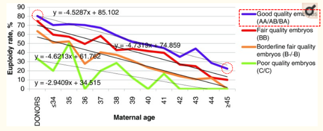 - 但大家注意看一下≥45歲的女性,優(yōu)質(zhì)胚胎(AA/AB/BA)中的整倍體率跨度最大,從最高80.30%降至22.22%。