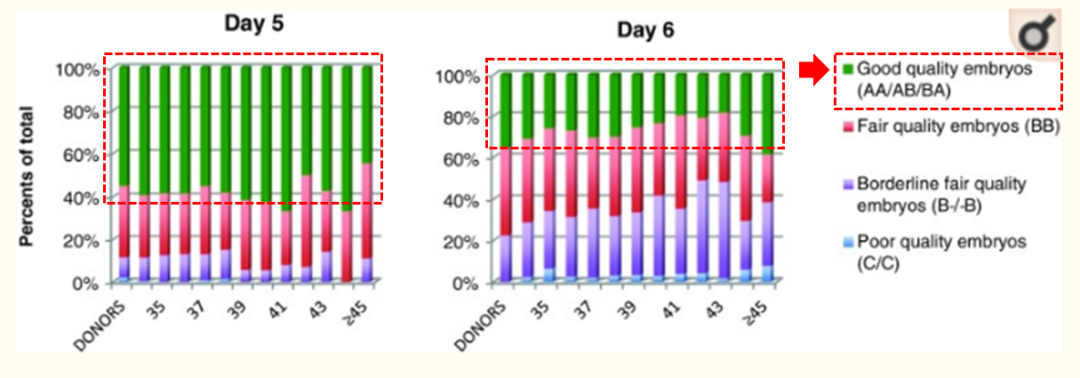 從上圖可以明確看出,在所有年齡組中,第5天胚胎活檢中有一半以上符合優(yōu)質(zhì)胚胎的標準(AA/AB/BA)。但是,在第6天進行活檢的胚胎中,被定為優(yōu)質(zhì)胚胎的數(shù)量明顯減少。