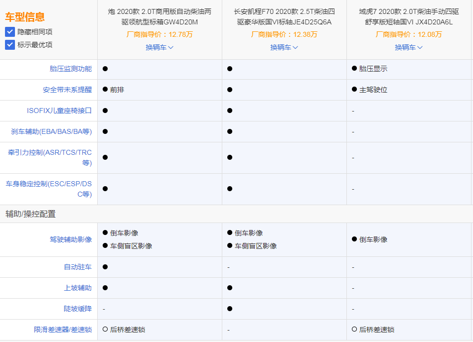談配置絕對不可以脫離價格,我們選擇三款車型中價格相近的配置進(jìn)行對比可以發(fā)現(xiàn),域虎7缺失了關(guān)乎安全的操控輔助系統(tǒng),這是不能接受的。長城炮與長安凱程F70在配置上十分接近,更便宜的長安凱程F70反而帶有陡坡緩降功能,明顯是比自動駐車更實用的越野配置。更值得一提的是,長安凱程F70的高配版搭載了長安最新智能車載互聯(lián)in-Call3.0系統(tǒng)及360°3D高清全息影像,能夠大大提高用車時的便利性和舒適性。還有前后駐車?yán)走_(dá)、定速巡航、徒坡緩降、上坡輔助等功能,大家在選購時可以進(jìn)行直觀的參數(shù)對比。