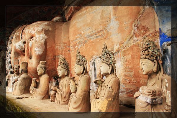 第二天一早直接買(mǎi)了長(zhǎng)途車(chē)票到北山縣城,再轉(zhuǎn)至“寶頂”。由于地震的影響,“寶頂”只開(kāi)了大佛灣,這其實(shí)又是一個(gè)佛、道、儒三位一體的地方,沿著山壁修建眾多的雕塑。其中一個(gè)山洞修建得格外神奇,佛臂形成隱蔽的排水系統(tǒng),洞頂?shù)目吡纬勺匀坏牟晒庀到y(tǒng),最為叫絕的是雕塑的精美絕倫,菩薩的衣衫栩栩如生仿佛風(fēng)來(lái)便起,蓮座下的石雕猶若木刻幾欲以假亂真!傲垒喕亍、“三圣像”、“大臥佛”也都各有特點(diǎn),繁雜、高大、精巧不一而足。轉(zhuǎn)至另一面,滿壁都是大大小小的雕塑,每個(gè)都是一個(gè)故事,只有跟著導(dǎo)游慢慢聽(tīng)才能聽(tīng)出門(mén)道了,可惜又下雨而且時(shí)間緊迫,只好一掠而過(guò)。