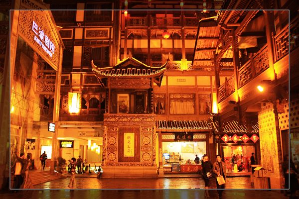 過(guò)了解放碑繼續(xù)向北可以走到“洪崖洞”,所謂的吊腳樓不過(guò)是之后翻建,晚上開(kāi)了燈,就著嘉陵江的燈火還是挺好看。其實(shí)這11層樓是一個(gè)集游覽、美食、購(gòu)物、休閑,甚至征婚交友的綜合場(chǎng)所,搞不懂為什么在那立一個(gè)禹王臺(tái)。這里風(fēng)味小吃、西餐和品級(jí)餐廳一應(yīng)俱全,也是個(gè)大快朵頤的好去處?吹浆F(xiàn)場(chǎng)制作的姜糖、牛扎糖,忍不住買(mǎi)了點(diǎn)吃,確實(shí)比超市里的味道好。第一天的晚餐就在這里的“小天鵝”解決的,紅油清亮,涮品精致,味道也不錯(cuò),牛舌和牛肉丸味道都極好,價(jià)格自然也比“奇火鍋”高了不少。那貪吃的朋友又露出遇見(jiàn)美食后詭異的微笑,呵呵。