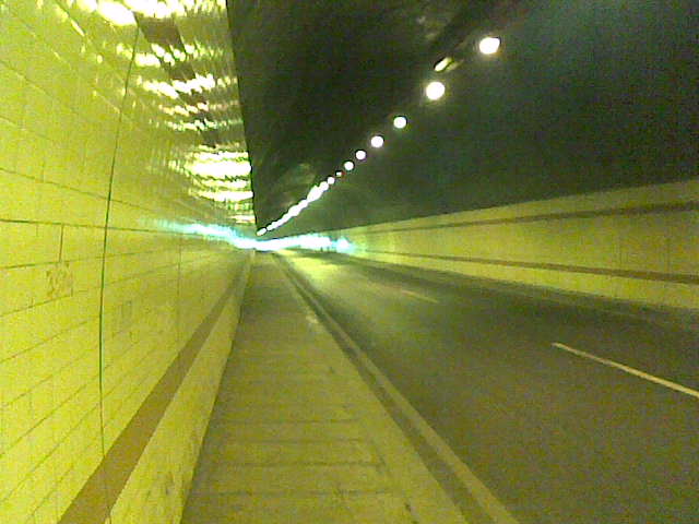 左邊隧道是來向車走的,雙車道,而且還有不到一米寬的步道;整個隧道也就1公里多一點(diǎn)的長度,慢慢走也花不了10分鐘,只要你忍受得了呼嘯而過的噪音和廢氣。隧道修好也有9年了,有幾處是滲水的,也被用紅筆做了記號。