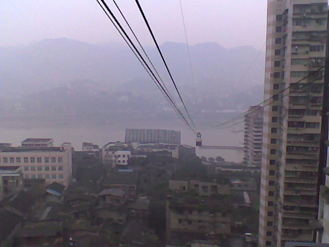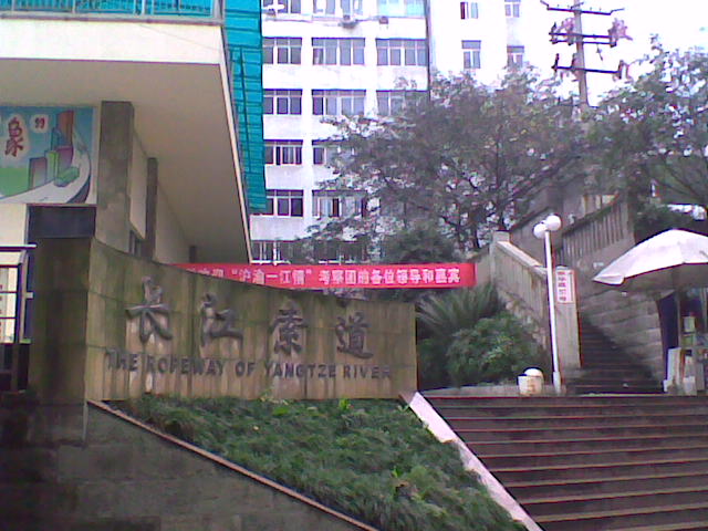 這個平臺望出去,不遠(yuǎn)處兩個轎箱相向而開,從高樓的半腰經(jīng)過;在欄桿邊向下望去,居然是垂直的10幾層的高樓,眩暈!索道轎箱聽聞,一干人爭先進(jìn)去找好自己的位置,工作人員鎖好門我們就出發(fā)了。出發(fā)的一瞬間有點(diǎn)晃,速度也快,但中途就慢下來,可以很仔細(xì)地看到腳下的錯落的樓房平房車輛人群;滑到江心的時候,長江兩岸的景物都是那么清楚---因為長江在這里江面不寬。5分鐘左后,我們就達(dá)到了南岸的平臺。