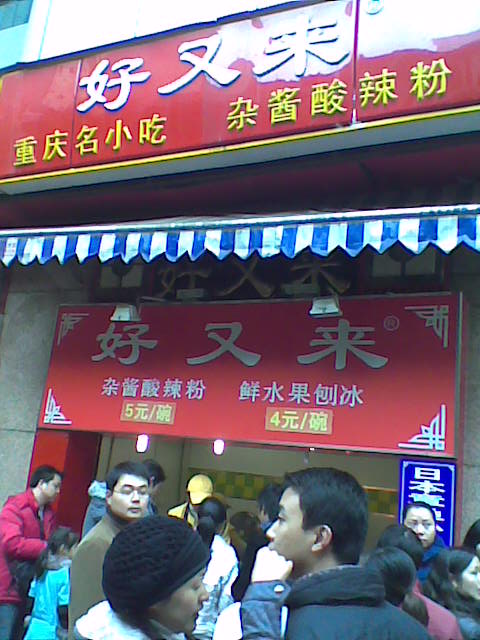 拎著兩大包回酒店退房,本來想寄存行李然后覓食,可惜那個酒店的前臺太小,她們很為難地把我的行李摞在別人行李上,我干脆就背走算了。不過這樣一來我的如意算盤沒了,因為背著行李拎著剛買的兩個包實在走不遠(yuǎn)。干脆回到八一路,排隊嘗到了好又來酸辣粉(5元一份,超爽);然后看路上一個瘋子表演了半天,再走到中華路吳抄手叫了一碗6元錢的清湯抄手清清被辣到的胃口。