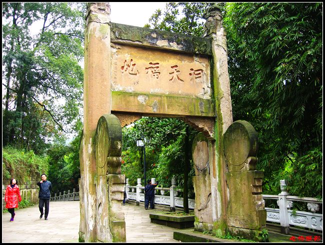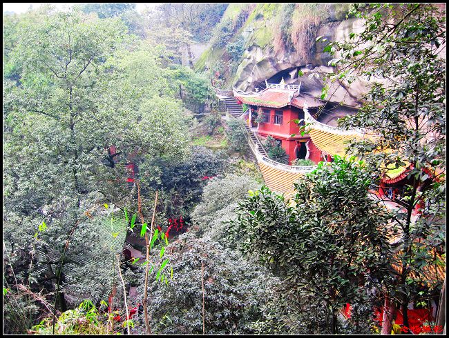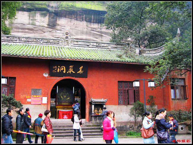 離開大雄寶殿一路下山就來到了華巖洞前。華巖寺的始建年代雖然無史可考,但是其“華巖”之名卻是因寺南側(cè)有一華巖洞而得。起初因山巖有洞,澗泉飛濺,狀如散花,遂以“花巖”為洞名,后改“花巖”為“華巖”,而后依洞建寺,以華巖洞著稱,亦沿稱華巖寺。華巖寺流傳著不少神奇的傳說,最著名的是“金雞筑巢”和“袈裟蔽日”。華巖洞即小寺,依山而建,與大寺隔湖相望,為華巖寺之祖廟。據(jù)華巖寺志載:“巴縣之西有伽藍(lán),曰華巖。明萬歷已亥,里人楊益延僧無權(quán)復(fù)建!比A巖寺屬佛教禪宗,自圣可大師首任住持以來,已傳六十四屆。石刻觀音,達(dá)摩佛像系畫圣吳道子白描珍品。五百羅漢雕像別具一格,每尊高不過一尺,寬約七寸,全部妙相以柳木鏤空浮雕而成,造于清嘉慶年間,乃佛教藝術(shù)之瑰寶。在深邃幽靜的華巖古洞右邊,有一尊石刻大乘臥佛——釋迦涅磐圣像,長約3米,神態(tài)安詳,左邊半崖上有刻于清同治年間的“有龍則靈”四個大字。
