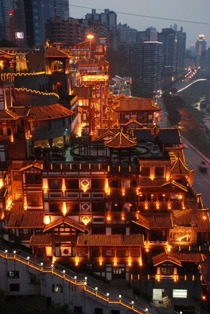 洪崖洞面向嘉陵江,主要是集餐飲、娛樂、購物等于一體的游覽場所。那里的渝菜館:小天鵝很有名,味道正宗,價格也不貴,有機會可以去嘗嘗。 |