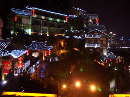 明天要去寶頂山石刻,有了今天的慘痛排隊經(jīng)歷,我有點后遺癥,看看攻略,發(fā)現(xiàn)路線挺折騰,先公共汽車,再長途汽車,再中巴。如果哪里都那么多人,都要排隊,估計我們明天就甭想從山上下來了。想想就不寒而栗,于是當(dāng)機立斷,跟旅行社。雖然我一向不贊同跟旅行社,不過事先有心理準(zhǔn)備,到時就不會太失望了。訂好旅行社,出去吃晚飯。晚上到很有名的翠云水煮魚吃。解放碑店:賽格爾酒店(五四路28號)5樓。我們叫了2個冷菜,4個熱菜,360元,除了水煮魚,還有一個缽缽粑青菜很好吃,其他的就都一般了。吃好晚餐出來,一直朝北,到洪崖洞。原來洪崖洞就在洪崖洞大酒店旁邊的電梯下去就是,不過下去是九樓。本來我們是準(zhǔn)備坐電梯到地下一樓一直逛到上面的,結(jié)果發(fā)現(xiàn)底下樓層商鋪根本沒開,只好去四樓逛小吃店。吃了一點豆?jié){肉串之類的。走到底是個回廊,夜景非常漂亮,值得一看。但總的來說,我覺得洪崖洞沒有什么好逛的,至少沒介紹的那么好玩。