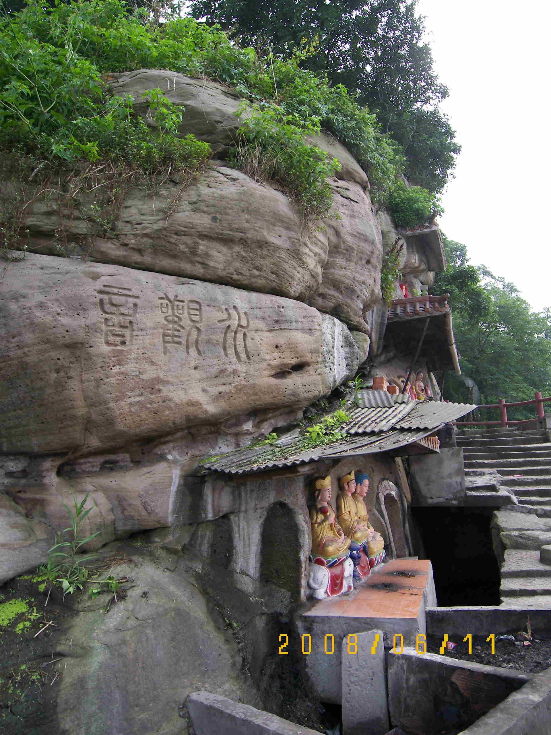 磁器口古鎮(zhèn)(原名白崖場),位于重慶城西14公里的嘉陵江畔。始于宋真宗咸平年間(公元998-1003年),在明朝成為繁華的商業(yè)碼頭,“白日里千人拱手,入夜來萬盞明燈”是其繁榮寫照。清朝初年,因生產(chǎn)青花磁,得名磁器口,古稱龍隱鎮(zhèn),差不多有1800年的歷史了.15:00乘上467(1元),幾分鐘就到了.往前走一點左手邊就是大門口,最熱鬧的是入口處右側(cè)轉(zhuǎn)彎到江邊碼頭這一段,功略里記載的陳麻花、龍隱毛血旺、張飛牛肉等等.陳麻花總店排隊的人太多,不高興等了,形成明顯反差的旁邊幾家店幾乎是門可羅雀.我是先走了左轉(zhuǎn)彎的這條,明顯冷清多了,走到幸福街回轉(zhuǎn),經(jīng)過繁多的商家,從鳳凰閣茶樓這里走高路去水觀音.水觀音其實可以說是摩崖石刻(可能稍稍夸張了些,還有其他一些佛爺,看樣子是民間自發(fā)的.拍完在岸邊看看風(fēng)景,這里時?梢妼懮娜.之前是傾盆大雨,現(xiàn)在艷陽高照,昨天船上已經(jīng)足夠日光浴了,今天就兔了吧.16:40看看功略上的美食指引,下到江邊走低路去吃飯.據(jù)說龍隱的不錯,不過小鍋35擔(dān)心太多,商量了一下,上了小份的,弄了份微辣的,感覺偏咸,味道還可以,雞雜就不肯加小份的了,此處攻略行不通了,呵呵.結(jié)帳26元,吃得肚膨氣脹,別的也裝不下了.回去的路上看到陳麻花人不多了,排隊買了半斤(5元).