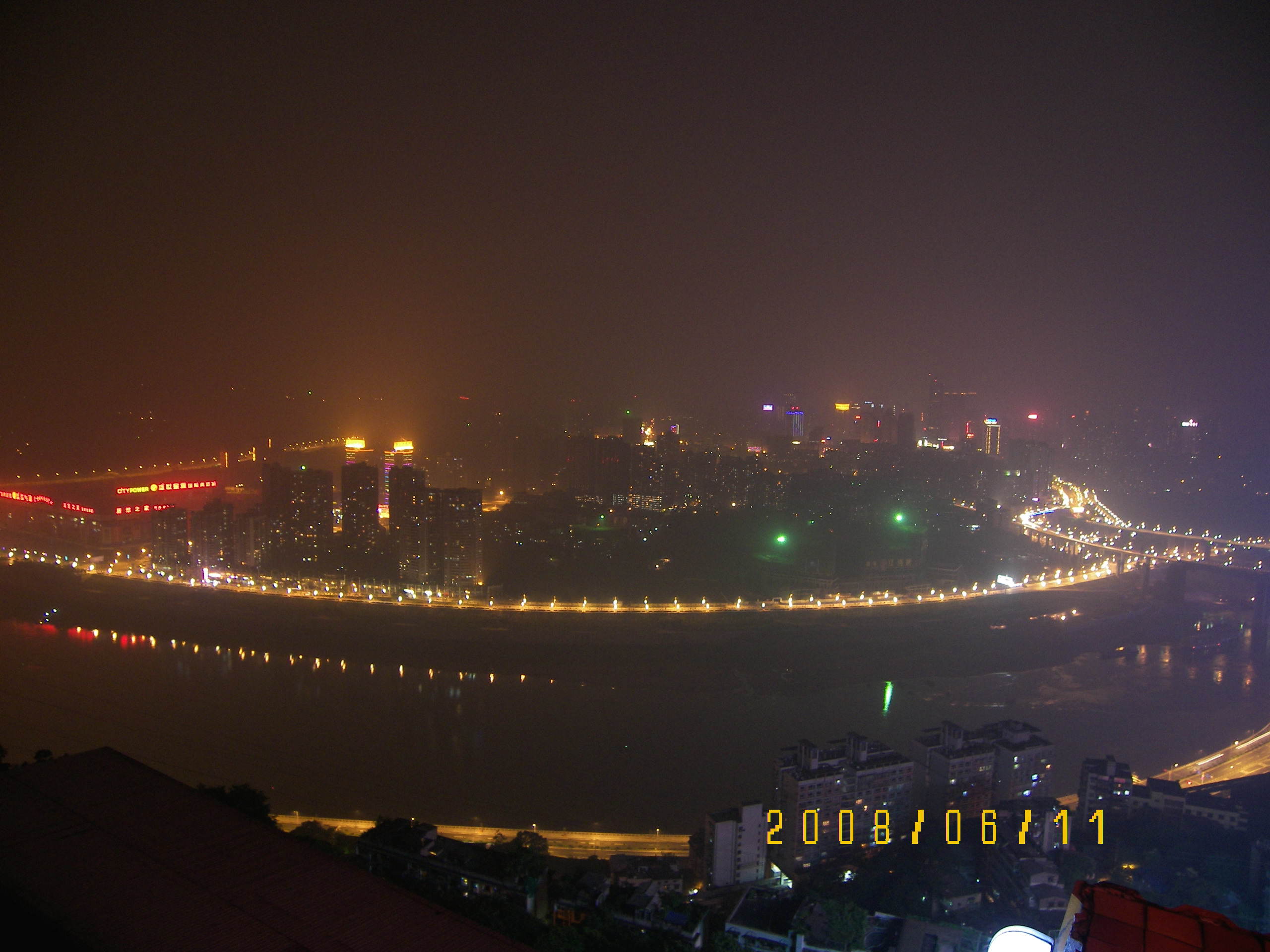 儂次走過厚慈街、守備街、花街子、解放西路到凱旋路乘電梯,在復(fù)旦中學(xué)旁邊,0.5元/次,似乎幾秒鐘就到了上面,繼續(xù)沿凱旋路走到德意世界,看到"大轟炸慘案遺址",右轉(zhuǎn)走一點就是解放碑步行街.重慶人似乎很愛熱鬧,解放碑基座四面圍坐了很多人.拍了幾張后回德意世界,從較場口E口乘輕軌去李子壩站(2元).出站前問工作人員,說晚上過去路不好找,建議我打車去,可是下到路邊,順方向一直沒車,只能逆方向,到鵝嶺公園門口打表7.7元,實收8元,說是慣例?不過態(tài)度還可以.下車進公園,沿右側(cè)道路去攬勝樓,稍爬了一些坡.到了攬勝樓,工作人員說晚上十點半關(guān)門,看看還有時間,抓緊上樓(門票5元).居高臨下,確實很漂亮,還有南濱路據(jù)說也不錯.