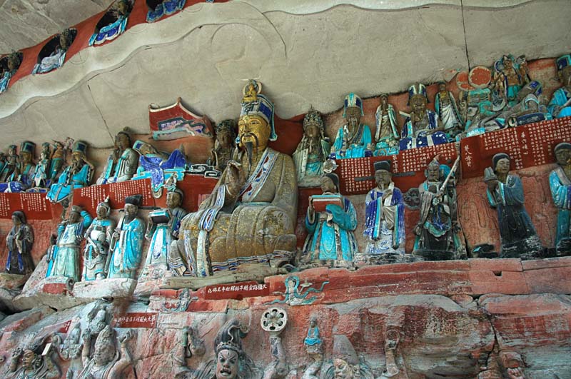 大足石刻規(guī)模較其它石窟要小,為中國(guó)唐宋時(shí)期石窟藝術(shù)的優(yōu)秀代表作品,并且集中國(guó)佛教、道教、儒家“三教” 摩崖造像藝術(shù)的精華。由于年代較近保存較好,佛像看上去很華麗鮮艷。造像刻于東、南、北三面崖壁上,通編為31號(hào)。依次刻護(hù)法神像、六道輪回圖、廣大寶樓閣、華嚴(yán)三圣、千手觀音、佛傳故事、釋迦涅磐圣跡圖、九龍?jiān)√、孔雀明王?jīng)變相、毗盧洞、父母恩重經(jīng)變相、雷音圖、大方便佛報(bào)恩經(jīng)變相、觀無(wú)量壽佛經(jīng)變相、六耗圖、地獄變相、柳本尊行化圖、十大明王、牧牛圖、圓覺(jué)洞、柳本尊正覺(jué)像等,描繪了各階層人物形象以及眾多的社會(huì)生活場(chǎng)面,彷佛置身于一幅生動(dòng)的歷史畫(huà)卷之中,不得不感嘆美工之精致無(wú)人能出其右。