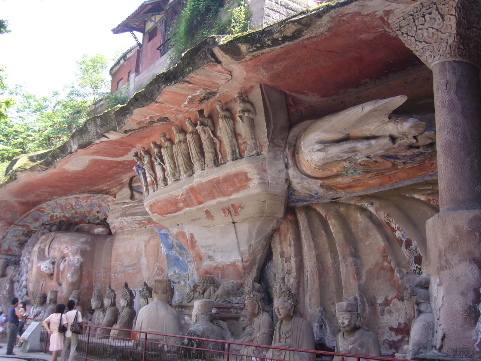 寶頂山的主要景區(qū)是大佛灣。景區(qū)的規(guī)模、石刻的數(shù)量不如我所到過的龍門石窟與云岡石窟,但是雕像的精美毫不遜色,也因?yàn)樾纬赡甏碛邶堥T和云岡,保存得比較完整。與眾不同的是,這里的石刻題材很有兼容性,佛、道共存,也有百姓生活化的內(nèi)容。進(jìn)門不遠(yuǎn),兩尊石像“道祖乘牛登岸上,