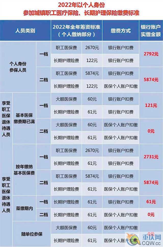 重慶市醫(yī)保局印發(fā)了《關于2022年以個人身份參加城鎮(zhèn)職工醫(yī)療保險、長期護理保險繳費有關問題的通知》,2022年以個人身份參加職工醫(yī)保的繳費標準保持去年不變,一檔繳費標準為2670元/年·人,二檔繳費標準為5874元/年·人。